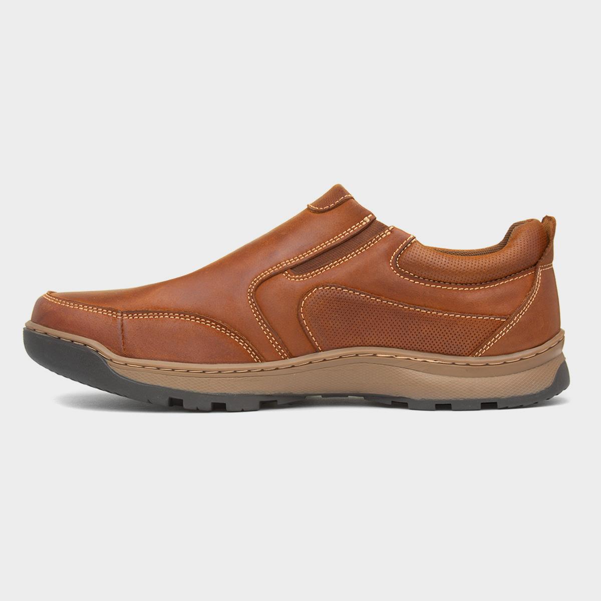 The men's shoes feature a tan leather upper with fine stitch detailing that adds contrast. Their cushioned insole provides comfort while their gripped outsole ensures stability. These casual shoes have a slip on design with elasticated side panels and a pull tab that makes these shoes even easier to get on and off.